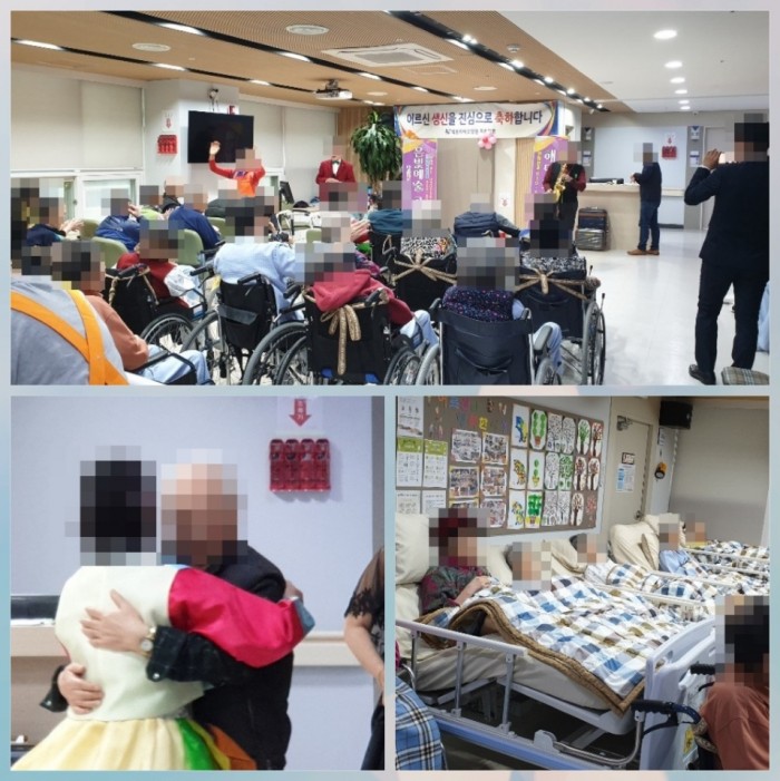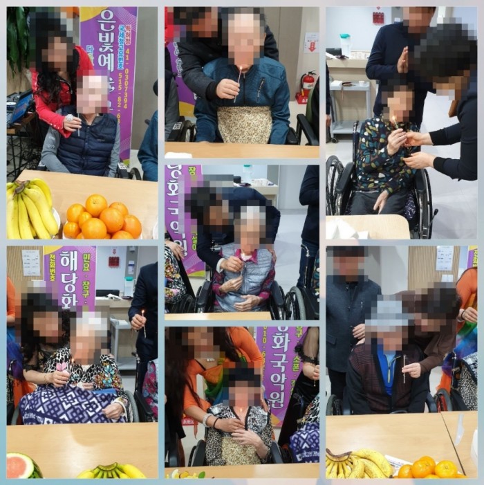 케이크와 과일 그리고 떡으로 잔치상을 꾸미고 생일 대상인 어르신들께서 촛불 하나씩 들고 불어보기도 하고 보호자와 사진도 찍으면서 즐거운 시간을 보냈습니다. 매달 공연단이 와주시는데요~ 어르신들이 흥에 겨워 노래도 따라부르고 춤도 추시고 무대로 나오셔서 노래도 한가락 뽑아주셨답니다^^