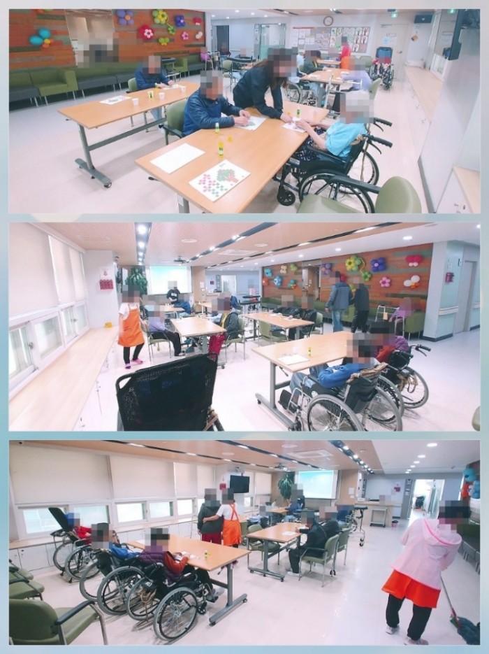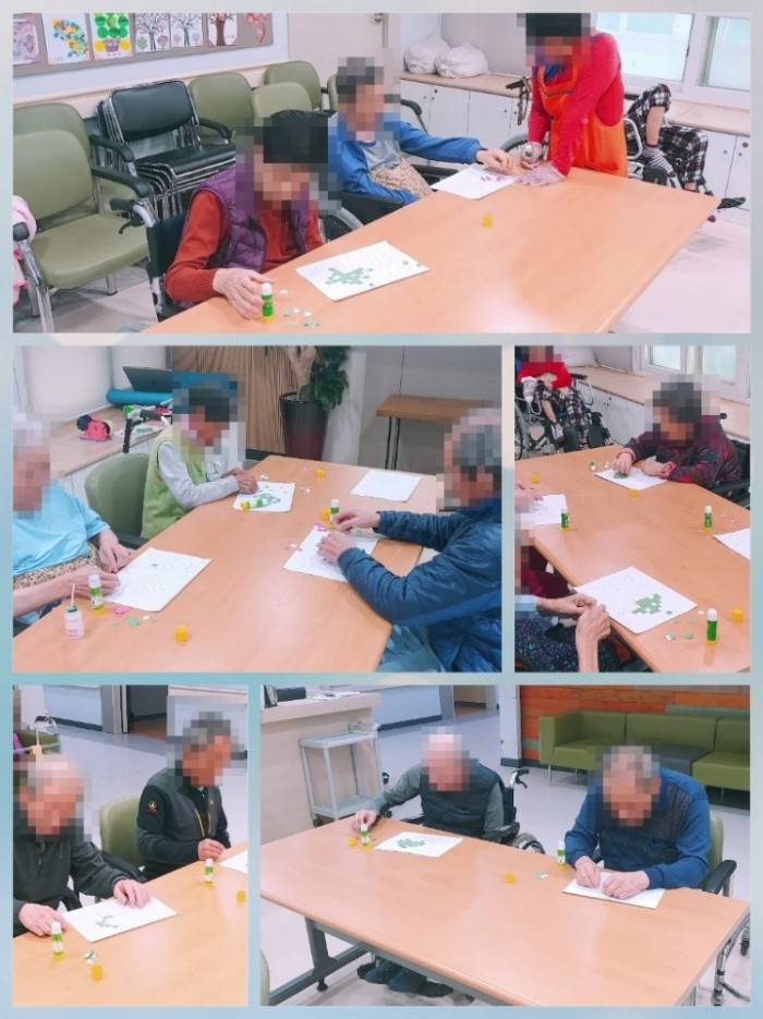 프로그램은 1시간으로 진행되어 지루하실수도 있는데 다들 작업에 집중하시느라 초집중상태였습니다:) 숫자가 1~6까지 각각 다른 색깔의 네모난 종이를 칸에 딱 맞게 붙여주시는 어르신들도 계셨고 대충 붙여주시는 어르신들도 계셨지만 많은 어르신들이 참여해주시는 덕분에 오늘 재료가 소진되어 작품을 완성하지 못하여서 아쉽기도 하였습니다.
