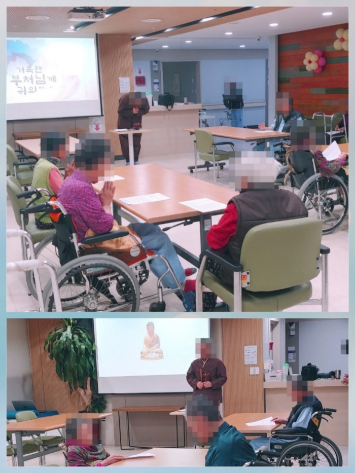 '눈에 보이는 것이 다가 아니다' 라는 말씀으로 마음속에 갖고 있는 행복과 다짐을 갖고 살아가야 한다는 내용이었는데요 :) 참석해주신 어르신들께서 진행자의 질문에 대답도 해주시고 불경과 말씀에 집중하여 경청하고 함께 고개도 숙이고 기도도 드리면서 예불 프로그램을 함께 하셨습니다.