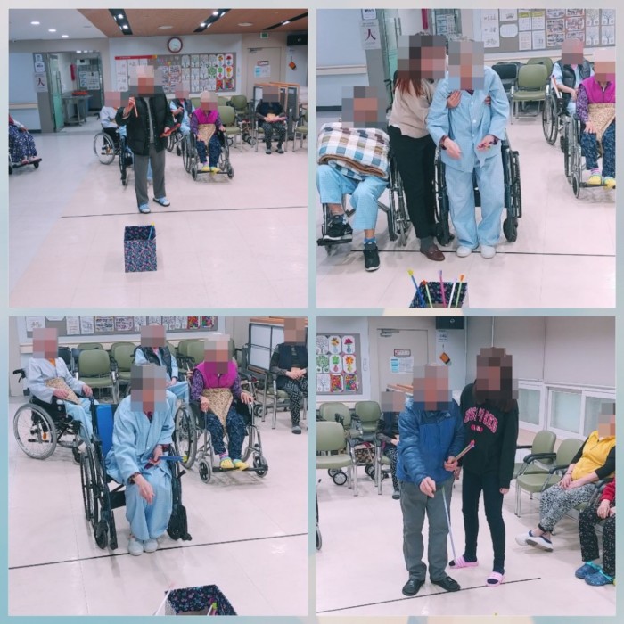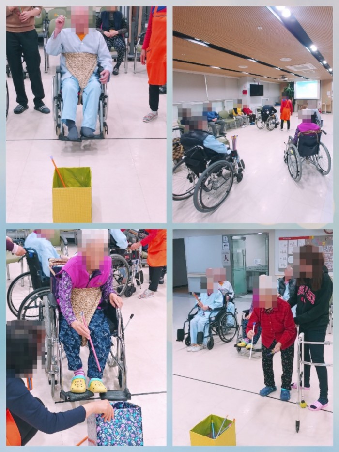 어렸을 때 한번쯤 경험해보셨을 투호놀이를 어르신들과 함께 즐겨보았습니다. 화살은 뾰족하여 다칠 위험이 있기에 수수깡으로 대체하여 진행해보았는데 어르신들이 연습 때는 잘 안 들어가서 속상해하셨지만 감을 잡으시고는 곧 잘 넣으시고 즐겁게 참여하셨습니다:) 역시 상품의 효과인걸까요 ~? 많은 어르신들께서 참여해주셨습니다^^