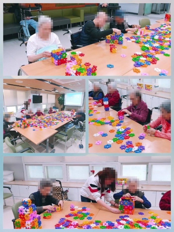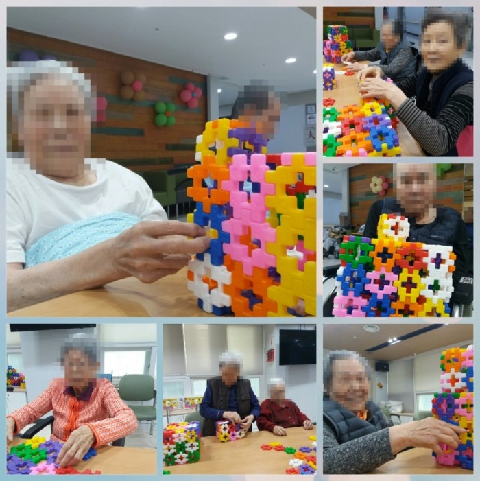 간단한 것 같으면서도 세심한 면이 필요한 와플블럭이기 때문에 어르신들 뇌기능 향상에 도움을 줄 수 있습니다.^^