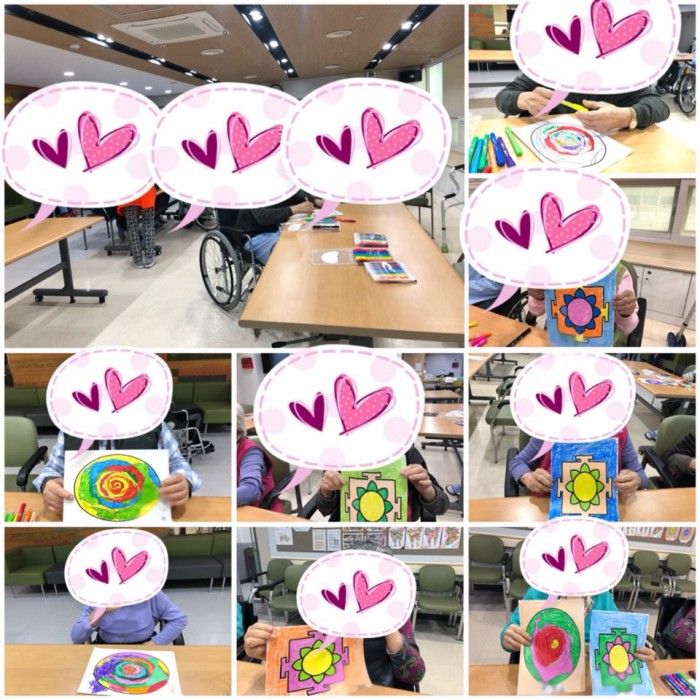 11월 14일 오후 프로그램은 미술치료 활동으로 진행되었습니다 ! 만다라 도안을 색칠할 때 기분이 좋고 행복하시다는 어르신들이 많이 계셨는데요 ~ 조금 복잡한 형태의 장미꽃 도안과, 쉬운 도안 2개를 준비했는데 2개 모두 끝내시고도 시간이 남으신 멋진 어르신도 계셨습니다 :-) 우리 빅토리아 요양원 어르신들은 미적 감각이 뛰어나신 것 같습니다 ~ 언제나 어르신들이 재밌는 만다라 활동을 하셨으면 좋겠습니다 ㅎㅎ