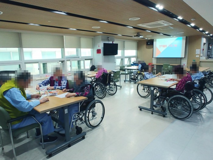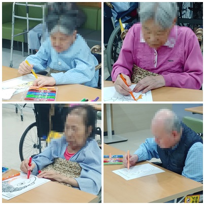 인지기능이 높은 어르신들은 활동지만 보고도 무엇을 해야 하는지 알아차리셨고 스스로 하는데 문제가 없었으며 인지기능이 낮은 어르신들은 반쪽을 그리지 못하셔서 진행자가 도와주거나 혹은 미리 그려 나눠드린 후 색칠만 하실 수 있도록 하였습니다.^^