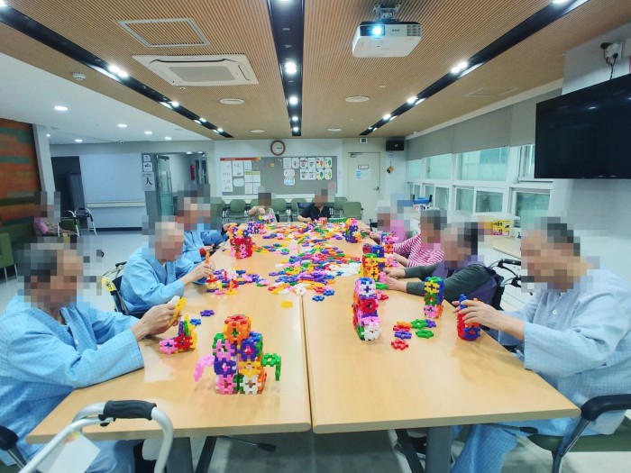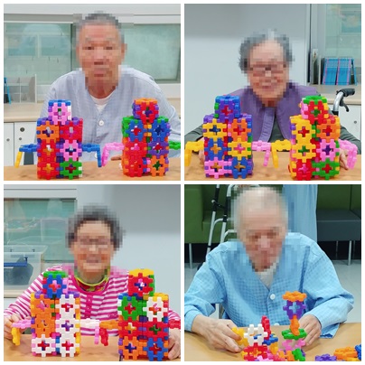 오랜만에 와플 블럭 프로그램을 진행하자 어르신들께서 어떻게 했었는지 기억이 잘 나지 않는다고 하여 간단하게 한 칸짜리를 다 같이 만든 후 ‘펭귄’을 만들어보는 시간을 가져보았는데, 처음에 보시고는 ‘이게 뭐야? 로봇이야?’라고 의문점을 가지셨지만 막상 2~3개씩 작품을 만들고서는 ‘귀엽네~’라고 하시며 펭귄이 뒤뚱뒤뚱 걷는다는 것을 직접 몸으로 표현하시기도 하였습니다:)