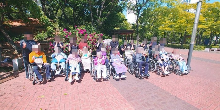 제한된 공간에서 벗어나 계절의 변화도 느끼고 풍경도 보면서 어르신들과 이야기를 나눠보았습니다. 공원 내의 포토존이라 불리는 장미꽃 앞에서도 어르신 개인별로 사진도 찍어드리고 봉사자들과 기념사진도 찍어드렸습니다.