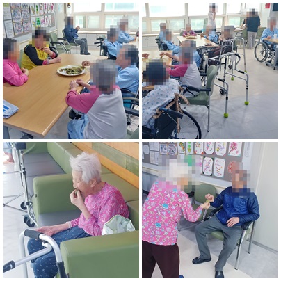 특화프로그램으로 오전에는 어르신들과 함께 "부추전 만들기" 요리프로그램으로 진행하였습니다. 먼저, 부추를 다듬기 위해 어르신들이 프로그램실로 모여주셨고, 부추를 드리자 다듬기 시작하셨고 그 이후에 씻는 물로 씻겨주고 먹기 좋은 크기로 썰어 준 후 물기는 말끔하게 제거하고 반죽과 섞어주어 뜨겁게 달군 후라이팬에 기름을 넉넉히 두르고 얇게 반죽을 올려서 구어 맛있게 드셨습니다:)