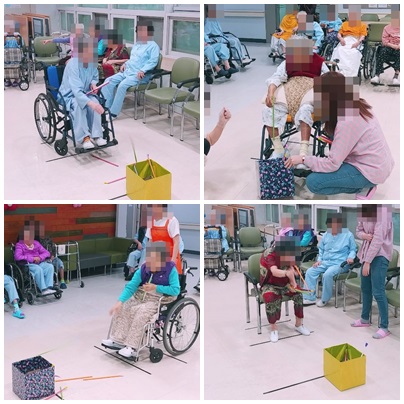 소정의 상품을 걸고 프로그램을 공지해드리니 평소에 참여하지 않으시는 어르신들도 나와서 참여하셨습니다. 프로그램 시작 후 30분동안은 연습시간으로 정확한 룰과 던지는 방법, 그리고 앉아서 던지시는 분과 일어서서 던지시는 분의 위치까지 설명해드리고 나서 본게임으로 들어가니 어르신들끼리 경쟁심을 자극하기도 하였습니다^^