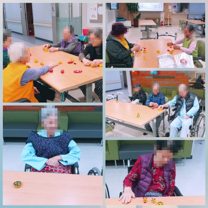 어르신들께 노란색, 흰색, 검정색, 빨강색 클레이를 각각 나눠드리고 샘플을 보여드려 만들어보는 시간을 가져보았는데요~ 돼지만 있으니까 소도 만들어야겠다고 이야기하시면서 진행자보다 더 다양하고 창의력있게 작품을 완성하셨답니다.