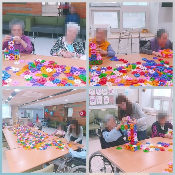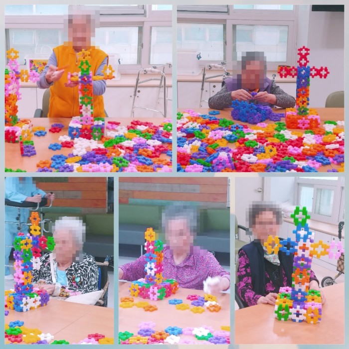 난이도가 어려워보이지만 잘 보면 똑같은 패턴의 반복이라 어르신들 반응이 제 각각이였습니다. '밑에가 튼튼해야 위로 쌓아도 안무너질텐데...' 라고 걱정하시는 어르신도 계셨고 '이야~ 요즘은 이런것도 있네' 라고 이야기하면서 다 만들어진 작품이 신기하다고 하십니다^^