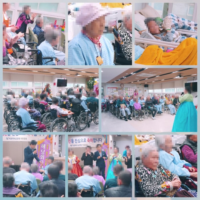 원장님과 케이크 커팅하고 촛불 하나씩 들고 노래에 맞춰 후~하고 어르신들께서 직접 꺼보았습니다:) 공연단의 공연도 보고 흥이 나시는지 무대 위로 올라가 댄스도 추시고 박수도 치고 즐거운 시간을 보냈습니다. 대상자 어르신들분 생신축하드리고 건강하게 오래사세요^^