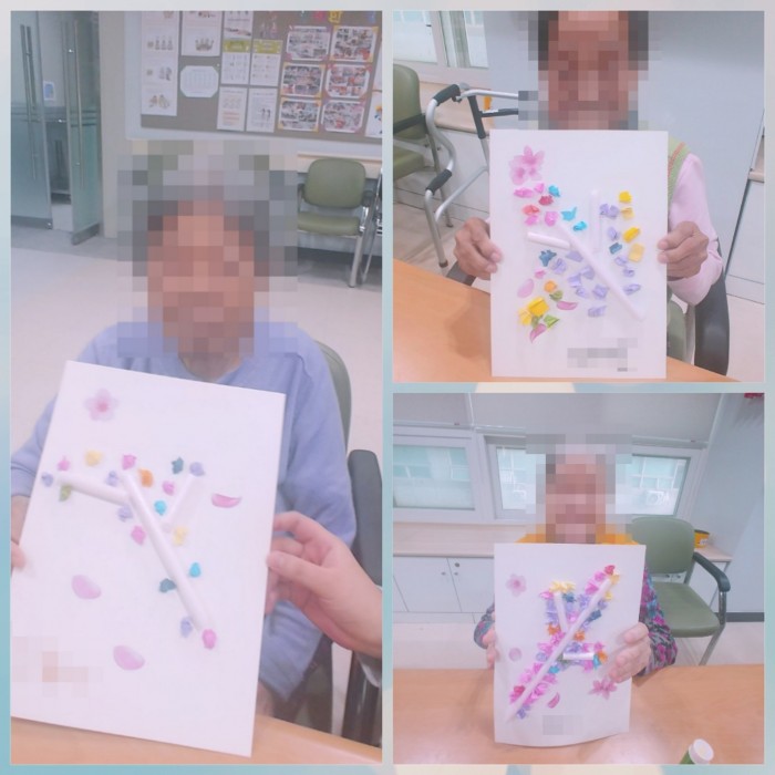 A4용지에 수수깡을 잘라 붙이고 어르신들께서 한지를 길게 찢어 구겨서 꽃잎을 표현하였습니다~ 구겨서 붙여도 되고 어떤 어르신께서는 곱게 접어 입체감있게 붙이시기도 하셨습니다:) 작품들을 완성하고 저희 원내 게시판에 예쁘게 꾸며놓았습니다.