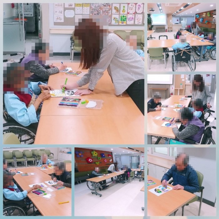 어르신들과 간단하게 캐릭터인 '짱구'를 색칠해보았는데요~ 밑그림 선을 넘지 않게 색칠하시는 어르신도 계셨고 알록달록하게 색칠도 하고 대부분 캐릭터가 무엇인지 인지하고 계셨답니다. 프로그램에 참여해주신 어르신들이 손가락을 이용하여 소근육 발달에도 도움이 되고 한분 한분마다 라포형성을 할 수 있었습니다^^
